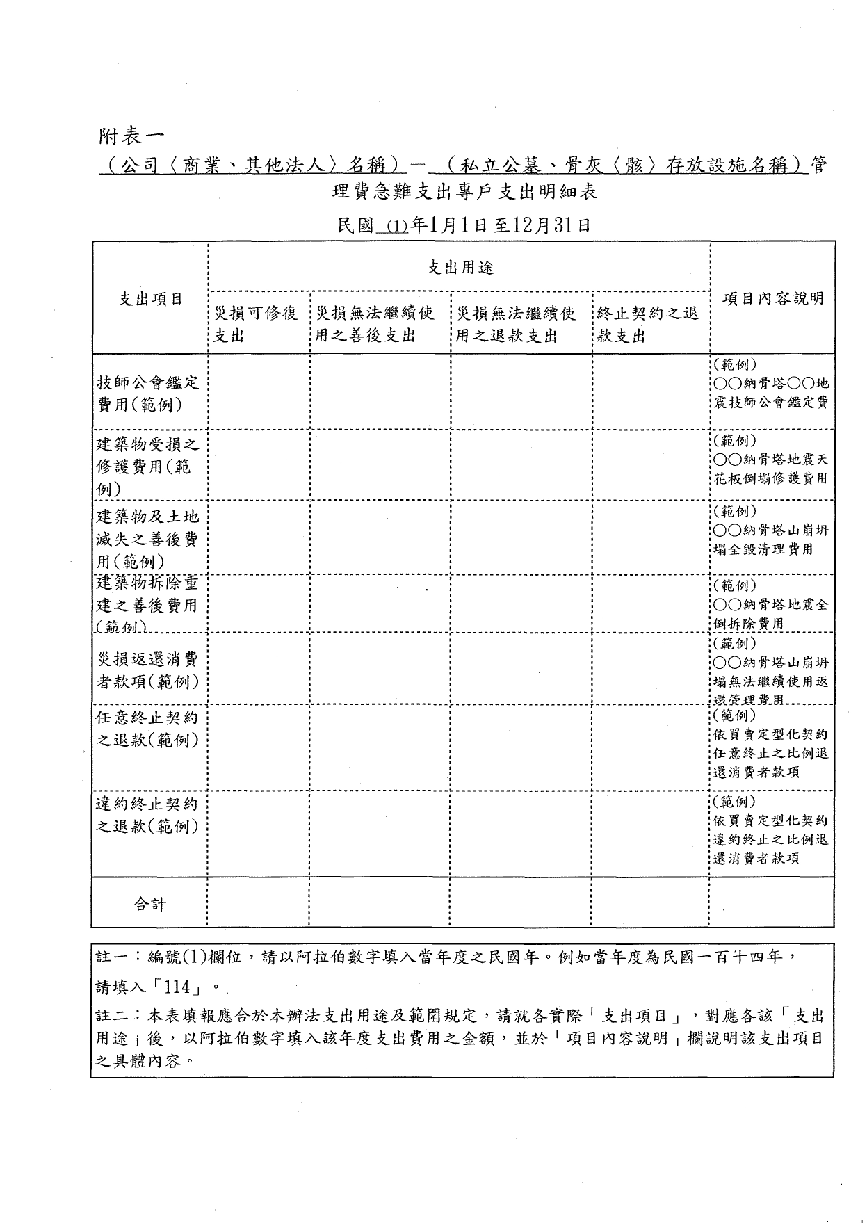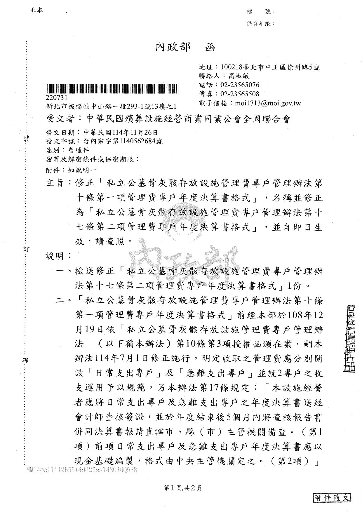 內政部有關修正「私立公墓骨灰骸存放設施管理費專戶管理辦法」相關事宜