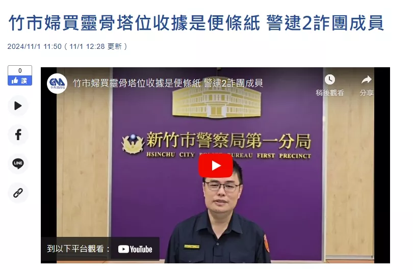 新竹市婦買靈骨塔位收據是便條紙 警逮2詐團成員