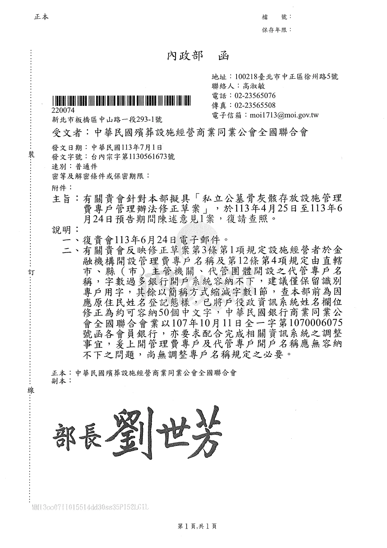 函轉內政部113年7月1日台內宗字第1130561373號函