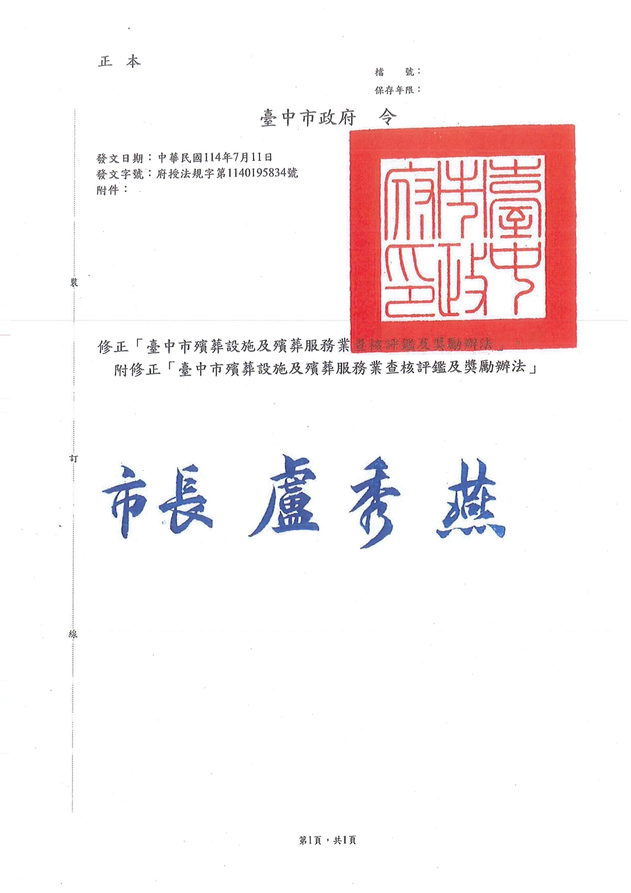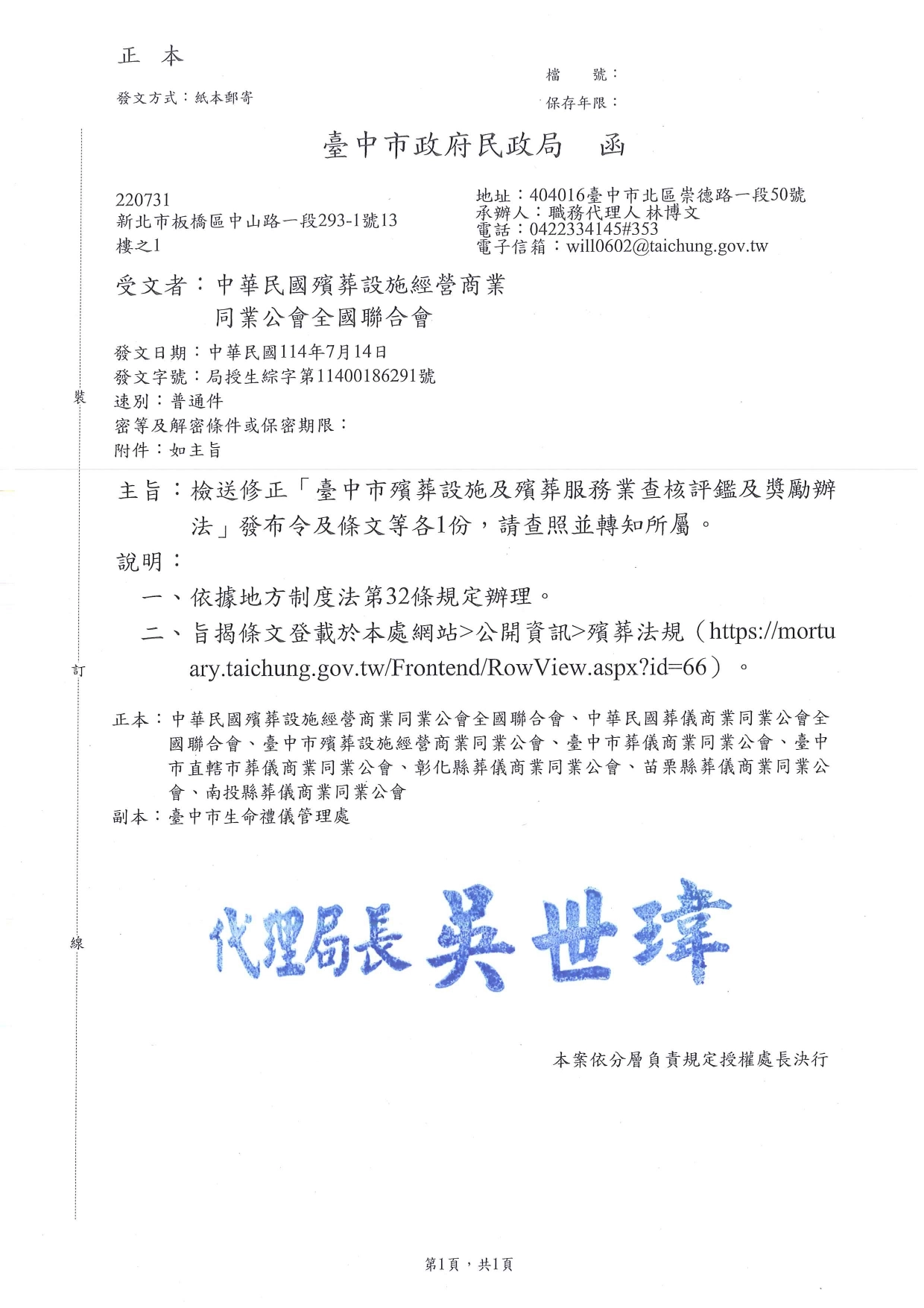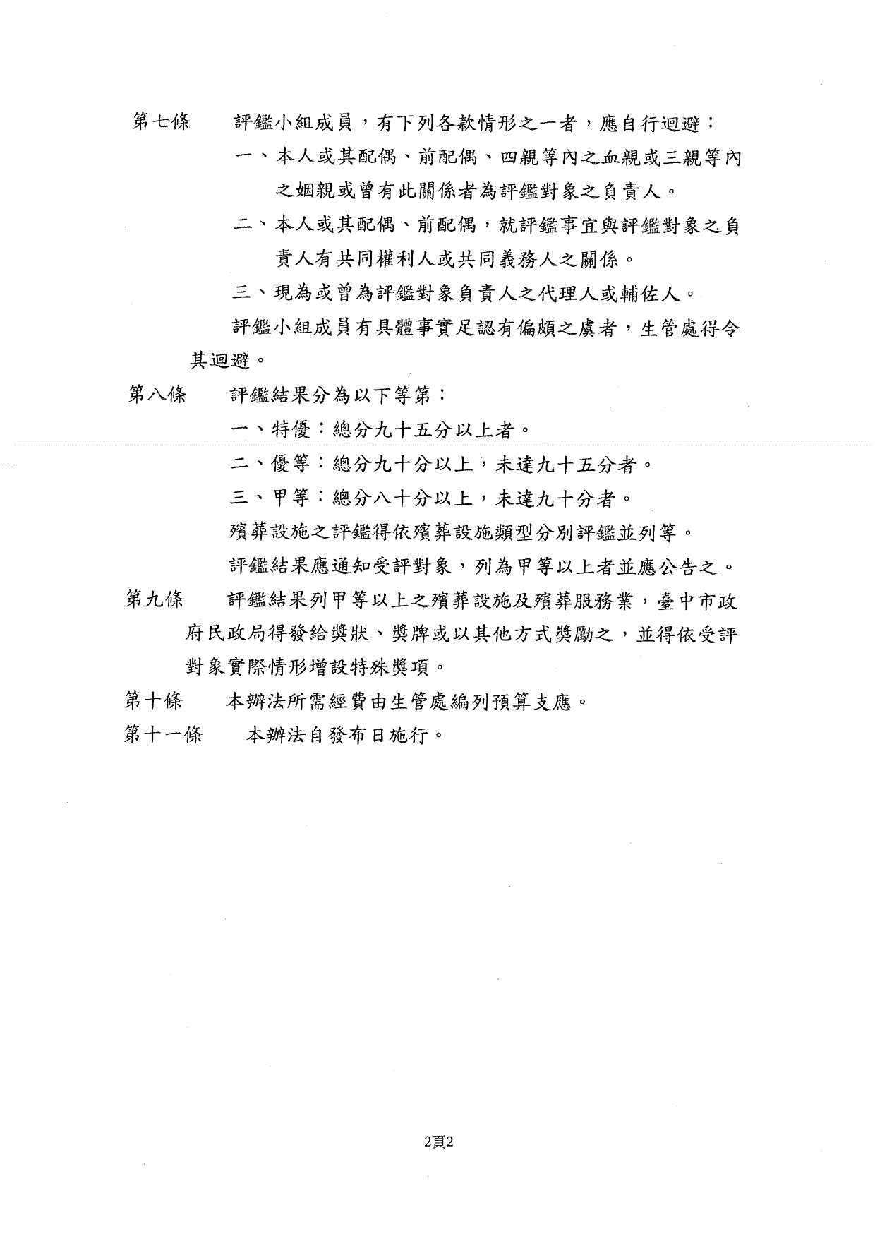 「臺中市殯葬設施及殯葬服務業查核評鑑及獎懲辦法」修正案