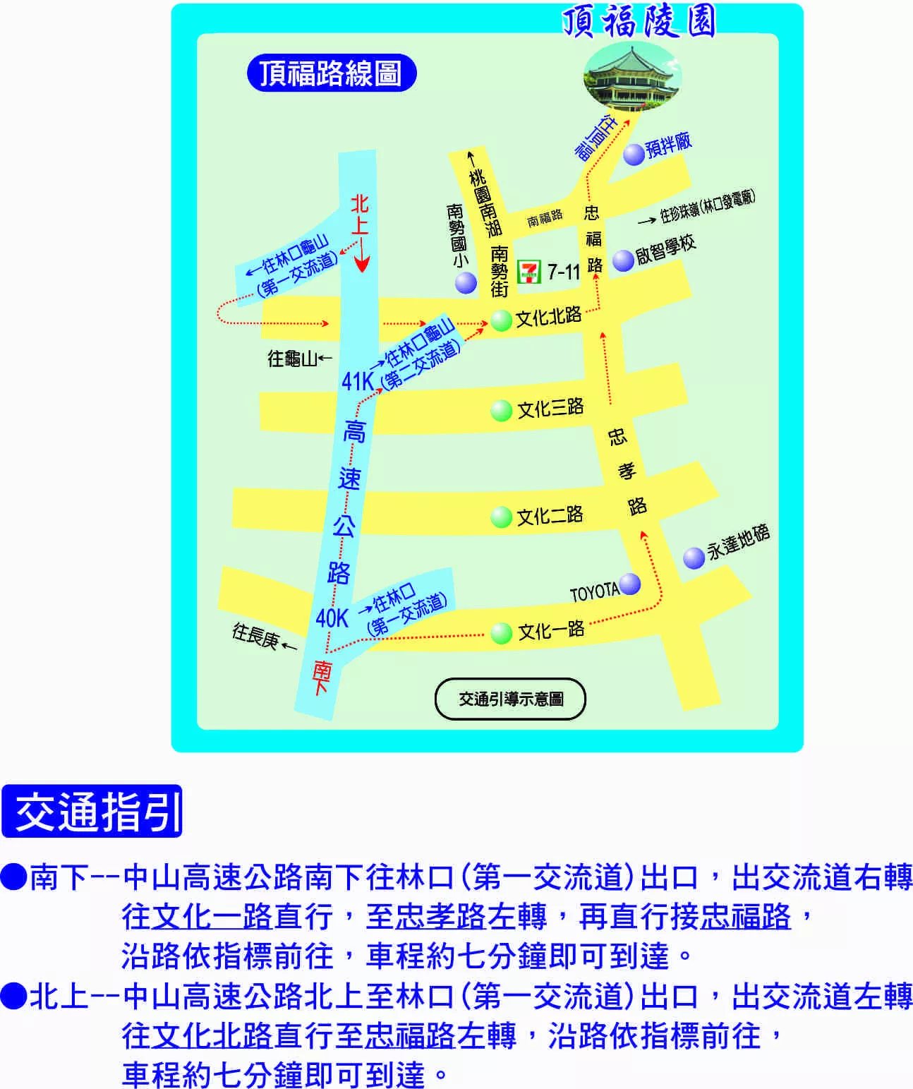 本園交通便捷,中山高速公路自林口交流道下,約7分鐘車程即可到達,另備有週日專車熱忱服務。