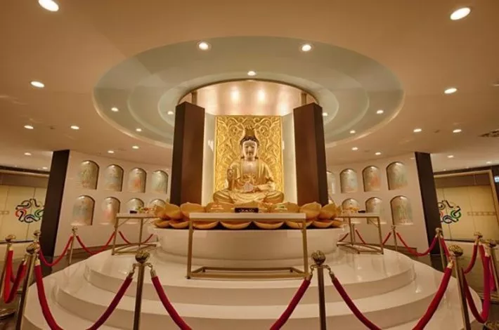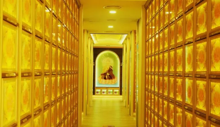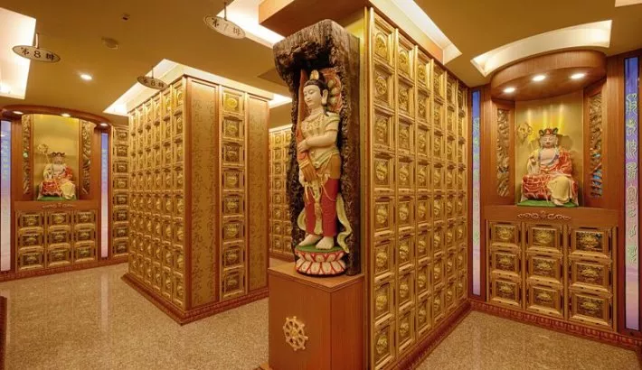 九樓愛區琉璃殿:格位面板為琉璃材質,以金黃色系搭配蓮花圖騰,整體設計華麗而莊嚴。