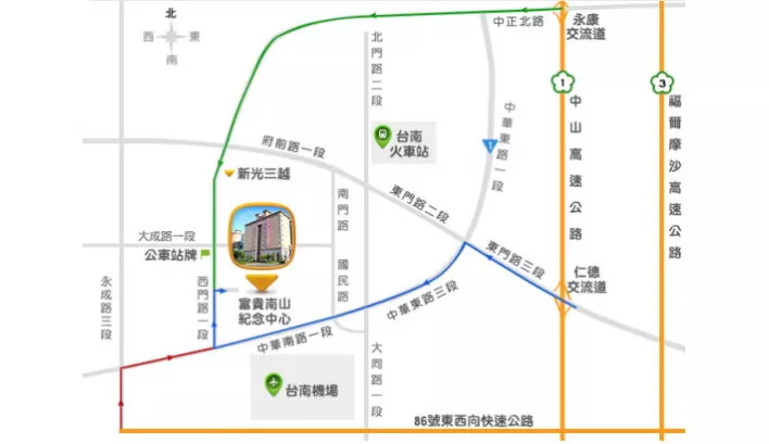 中山高速公路下永康交流道(中正北路)→接中正南路→接西門路(約37分鐘)中山高速公路下仁德交流道(東門路)→左轉中華東路→接中華南路→右轉西門路 (約15分鐘)
